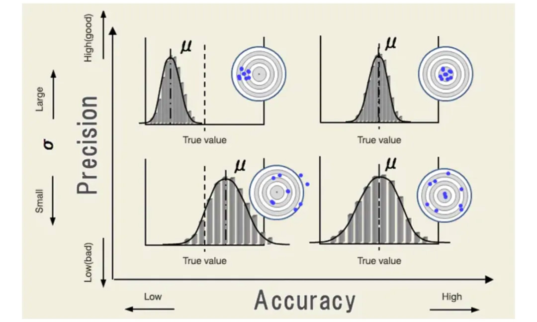 “準確度”是衡量其接近“真實值”的程度。另一方面,“精密度”是衡量多次測量值變化的指標,也稱為“重復性”。