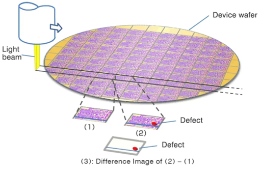 晶圓上的圖案通過電子束或光線沿芯片陣列捕獲。通過比較待檢測芯片的圖像(1) 和相鄰芯片的圖像 (2) 來檢測缺陷。如果沒有缺陷,則通過數(shù)字處理將圖像 2 從圖像 1 中減去的結(jié)果將為零,并且不會檢測到任何缺陷。相反,如果芯片 (2) 的圖像中有缺陷,則缺陷將保留在減去后的圖像 (3) 中,如圖所示。然后檢測缺陷并記錄其位置坐標。