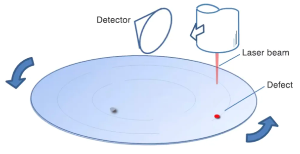 當激光束投射到旋轉(zhuǎn)晶圓的顆粒/缺陷上時,光會發(fā)生散射并被檢測器檢測到。因此,檢測到顆粒/缺陷。根據(jù)晶圓旋轉(zhuǎn)角度和激光束的半徑位置,計算并記錄顆粒/缺陷的位置坐標。鏡面晶圓上的缺陷除了顆粒外,還包括COP等晶體缺陷。