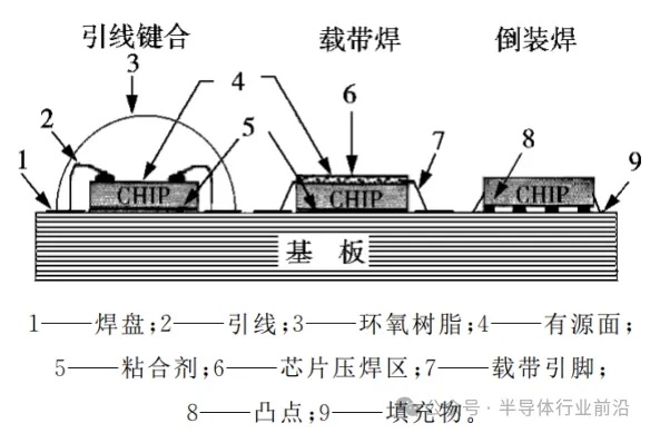 電子元件中芯片直接粘合在基板上,芯片內(nèi)部輸入和輸出之間的互聯(lián)就需要用到鍵合,包括三種方式——引 線鍵合、載帶自動鍵合和倒裝芯片鍵合。(1)引線鍵合(Wire Bonding)是用金屬絲將集成電路芯片上的 電極引線與集成電路底座外引線連接在一起的過程,是目前應(yīng)用最廣泛的一種鍵合方式。(2)載帶自動鍵 合(TAB,Tape Automated Bonding):隨著WB無法適應(yīng)電子整機高密度、超小超薄、芯片尺寸和焊區(qū)越 來越小而出現(xiàn)的,包括芯片焊區(qū)凸點形成、載帶引線制作、內(nèi)引線焊接、基板粘接和外引線焊接等。(3) 倒裝芯片鍵合(FCB,F(xiàn)lip Chip Bonding):芯片面朝下、將芯片焊區(qū)和基板焊區(qū)直接互連的鍵合方法,一 般先將芯片的焊區(qū)形成一定高度的金屬凸點后再倒裝焊到基板焊區(qū)上。