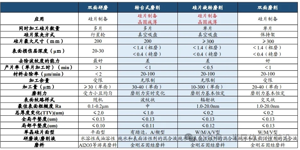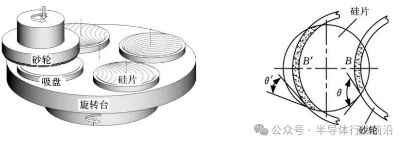 轉(zhuǎn)臺式磨削為磨輪轉(zhuǎn)動,但晶圓自身并不自轉(zhuǎn)。轉(zhuǎn)臺式磨削與晶圓分別固定于旋轉(zhuǎn)臺的吸盤上,在轉(zhuǎn)臺的帶 動下同步旋轉(zhuǎn),晶圓本身并不繞其軸心轉(zhuǎn)動,砂輪高速旋轉(zhuǎn)的同時沿軸向進給,砂輪直徑大于晶圓直徑。? 轉(zhuǎn)臺式磨削有整面切入式(Face Plunge Grinding)和平面切向式 (Face Tangential Grinding)兩種,區(qū)別在 于磨輪是否能完全覆蓋晶圓。整面切入式加工時,砂輪寬度大于晶圓直徑,砂輪主軸沿其軸向連續(xù)進給直至 余量加工完畢,然后晶圓在旋轉(zhuǎn)臺的帶動下轉(zhuǎn)位;平面切向式磨削加工時,砂輪沿其軸向進給,晶圓在旋轉(zhuǎn) 盤帶動下連續(xù)轉(zhuǎn)位,通過往復(fù)進給方式(Reciprocation)或緩進給方式(Creep Feed)完成磨削。? 該種方法下實際磨削區(qū)面積 B 和切入角θ(砂輪外圓與硅片外圓之間夾角)均隨著砂輪切入位置的變化而變化, 導致磨削力不恒定,TTV值較高、容易塌邊、崩邊,轉(zhuǎn)臺式磨削不適合300mm(12英寸)以上單晶硅片的磨 削加工。