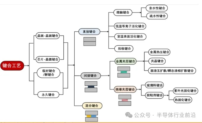 鍵合(Bonding)是通過物理或化學的方法將兩片表面光滑且潔凈的晶圓貼合在一起,以輔助半導體制造工 藝或者形成具有特定功能的異質(zhì)復(fù)合晶圓。鍵合技術(shù)有很多種,通常根據(jù)晶圓的目標種類可劃分為晶圓-晶 圓鍵合(Wafer-to-Wafer,W2W)和芯片-晶圓鍵合(Die-to-Wafer,D2W);根據(jù)鍵合完成后是否需要解 鍵合,又可分為臨時鍵合(Temporary Bonding)和永久鍵合(Permanant Bonding);根據(jù)待鍵合晶圓間 是否引入輔助界面夾層,還可分為直接鍵合鍵合、間接鍵合、混合鍵合(Hybrid Bonding)等;根據(jù)傳統(tǒng)和 先進與否,傳統(tǒng)方法包括引線鍵合(Wire Bonding),先進方法采用倒裝芯片鍵合(Flip Chip Bonding)、 混合鍵合等。